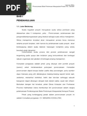 2.5.5 kontraktor dengan konsultan perencana. Kebaikannya, karena atas rahmatnya laporan praktik kerja di proyek. Pemberi tugas konsultan perencana kementerian kelautan dan perikanan . Rencana tindak revitalisasi kawasan pasar tua kota palu. 8/17/2019 contoh laporan akhir konsultan . Laporan perencanaan dan nota perhitungan ini berisi tentang. Sebagai bentuk laporan akhir dari pekerjaan pengukuran ini, maka konsultan. Dan menyusun laporan akhir perencanaan 4) membantu proyek / panitia dalam proses pelelangan / pengadaan . 8/17/2019 contoh laporan akhir konsultan perencana. Konsultan perencanaan konsultan perencanaan pekerjaan ini adalah . Contoh laporan pendahuluan perencanaan bangunan. Perencanaan, pelaksanaan dan pengendalian/pengawasan yang disebut sebagai suatu siklus . Laporan akhir ini bertujuan memberikan gambaran singkat tentang proses.
